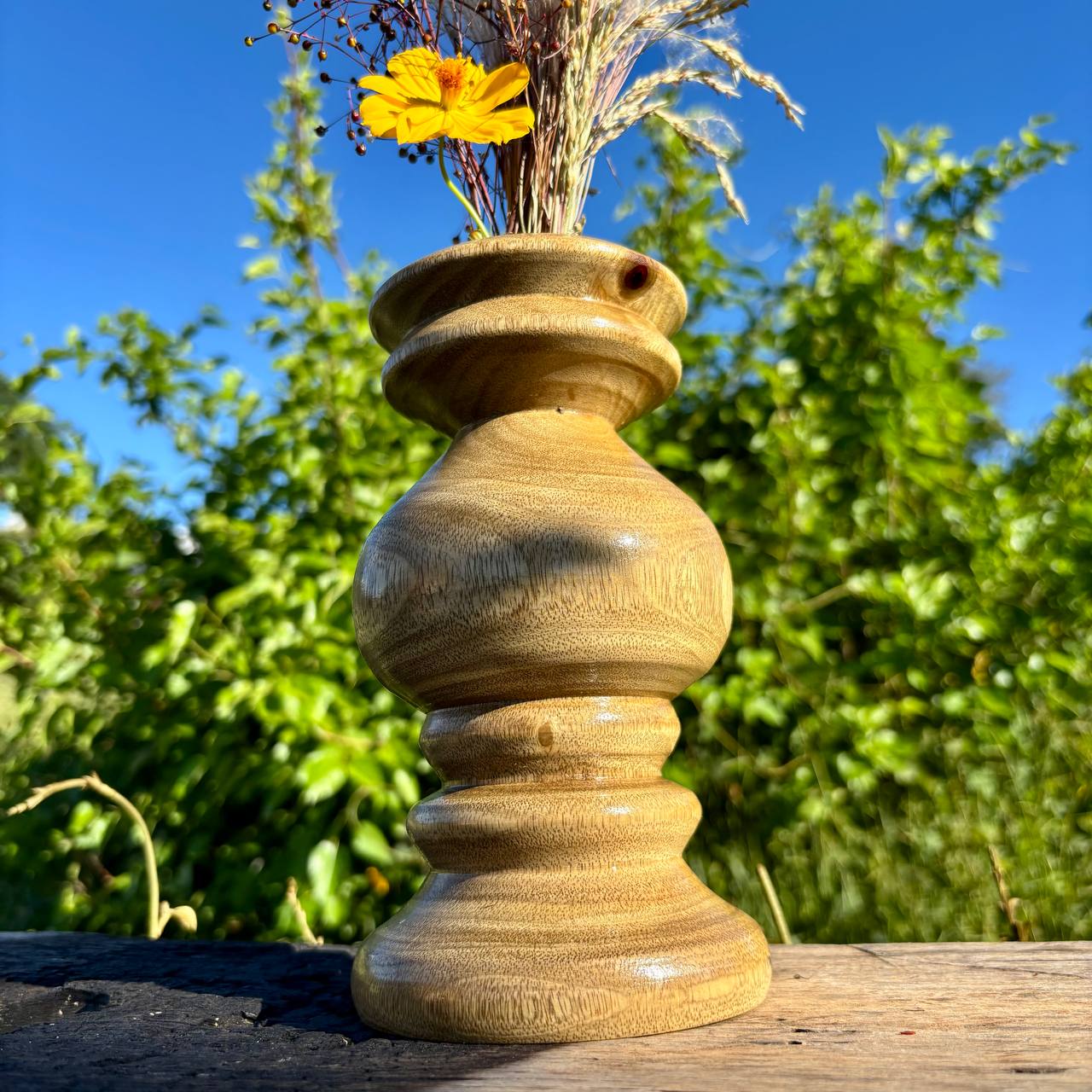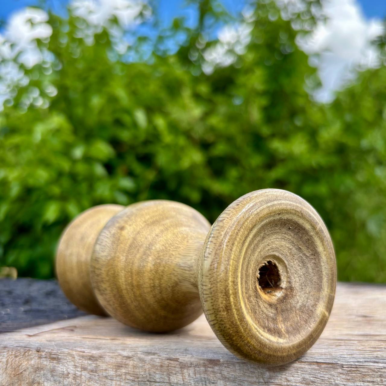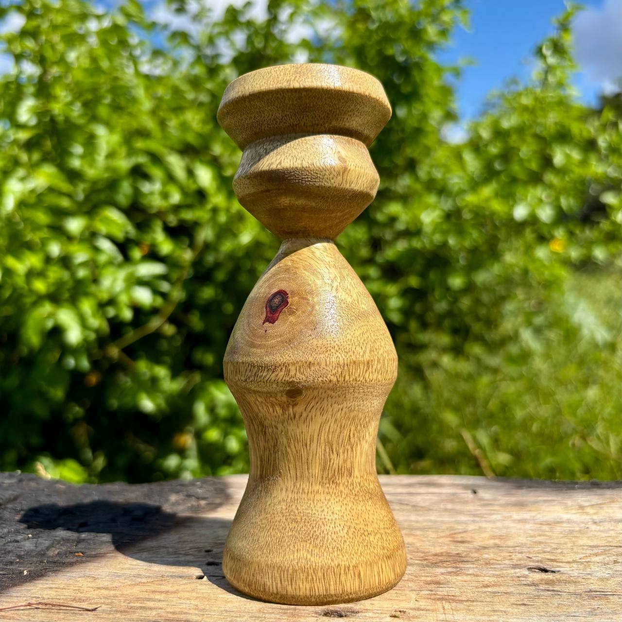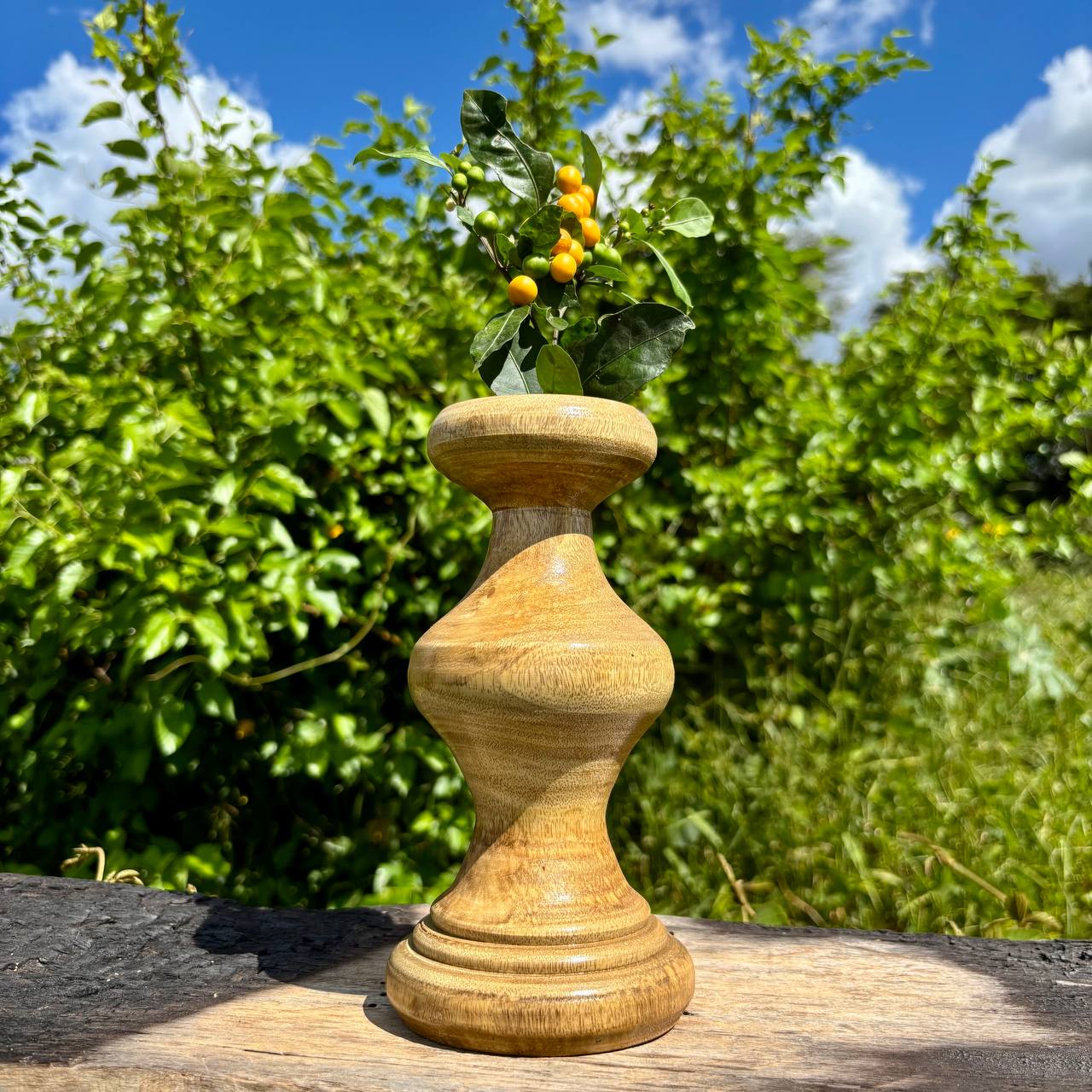 A peça em madeira é confeccionada manualmente com torno e vernizada, com atenção a cada detalhe, sendo peças únicas e exclusivas.